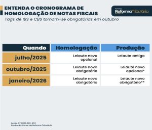 O ambiente de produção com o novo leiaute estará disponível a partir de outubro de 2025. O preenchimento das novas informações será opcional até dezembro de 2025, tornando-se obrigatório, com aplicação das regras de validação, a partir de janeiro de 2026.